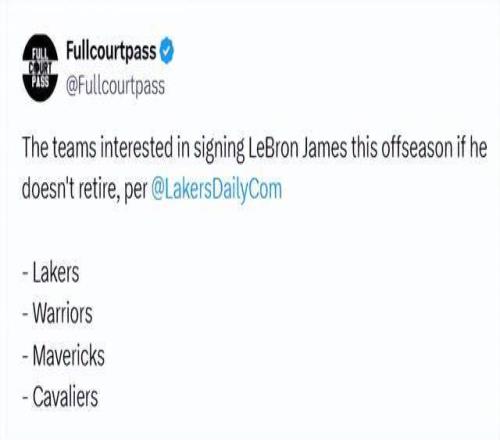 北京時間1月31日,據(jù)《湖人日報》消息人士透露,若勒布朗-詹姆斯不在本賽季休賽期退役,這位未來的名人堂成員將會收到四支球隊的追逐邀約。