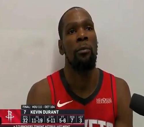北京時間今日,在NBA常規(guī)賽中,休斯頓火箭隊在客場以111-104擊敗了底特律活塞隊,終結(jié)了對方的四連勝。賽后,火箭球星杜蘭特接受了采訪。