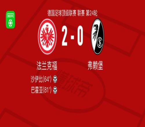 北京時(shí)間3月2日德國(guó)足球頂級(jí)聯(lián)賽 聯(lián)賽 第24輪,法蘭克福主場(chǎng)對(duì)陣弗賴(lài)堡。法蘭克福沙伊比破門(mén),巴霍亞破門(mén)。最終比分法蘭克福 2-0 弗賴(lài)堡。