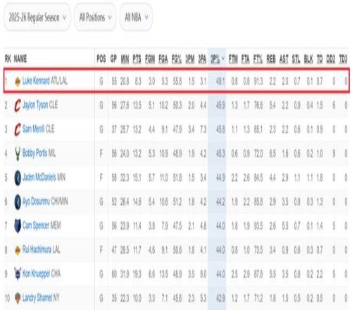 肯納德打出了投籃180俱樂部的表現(xiàn)——投籃命中率50%以上,三分命中率40%以上,罰球命中率90%以上。在本賽季的三分命中率榜上,肯納德高居第一。騎士隊(duì)的泰森以45.9%排名第二,梅里爾45.8%排名第三,波蒂斯以45.3%排名第四,杰登·麥克丹尼爾斯以44.9%排名第五。