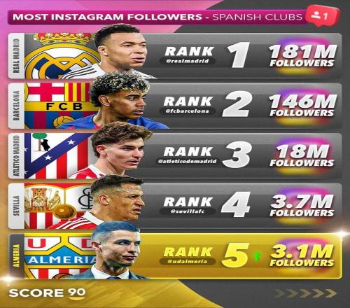 在C羅完成對阿爾梅里亞俱樂部的部分股權(quán)收購后,阿爾梅里亞俱樂部的官方社交媒體賬號粉絲數(shù)量飆升,截至目前,阿爾梅里亞的社媒賬號粉絲量達(dá)到了310萬,成為粉絲數(shù)量第五多的西班牙足球俱樂部。